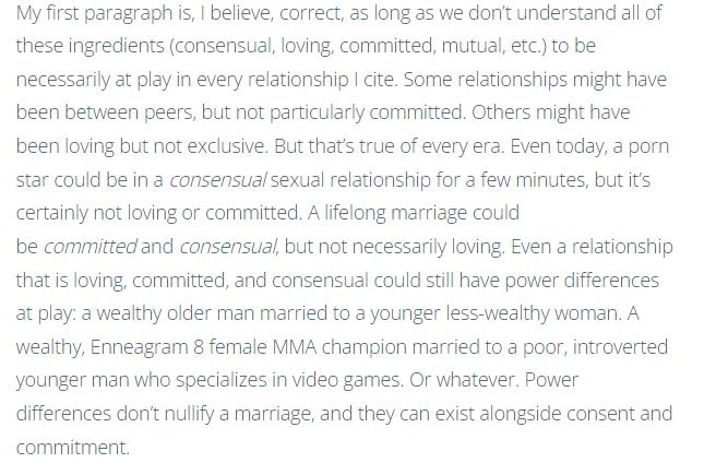 He then claims (inaccurately) that “the historic Christian church, in all its diversity, would agree with the essential aspects of this definition”. It isn’t clear which aspects Sprinkle sees as “essential” but the Catechism of the Catholic Church defines marriage without reference to “telling God’s story” or “different families”; and the Statement of Faith in an Anabaptist Perspective doesn’t mention those (or “one-flesh unions") either. The SBC’s Baptist Faith And Message leaves those elements out too as does the PCA’s Book of Church Order. In fact Sprinkle seems to be rather alarmingly overstating his case here and this does matter since Sprinkle puts a lot of weight on the “telling God’s story of faithfulness and creativity” bit of the definition throughout his book. Certainly it is the case that a slew of theobrogians2 over the last few decades have latched on the a belief in marriage’s importance as a metaphor for Christ and the Church, but it is hardly the case that supplying a metaphor is part of any historical Christian view of marriage.